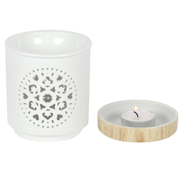 Bring a touch of serenity to your home with this white ceramic oil burner, featuring a delicate cutout mandala design and a wood-effect ceramic base. Simply add fragrance oil or wax melts to the built-in dish and place a standard tealight inside to gently fill your space with calming aromas.